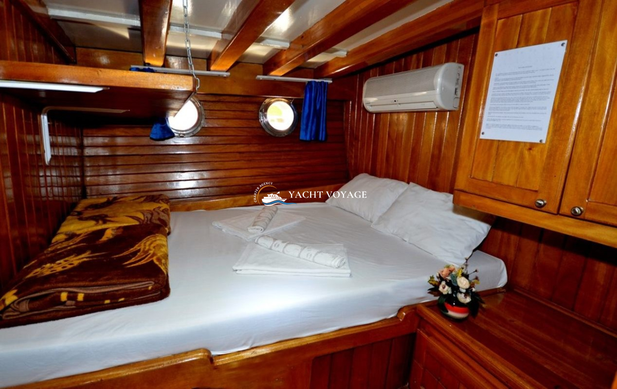 27 metrelik gulet, 8 metrelik eni ile oldukça geniştir. Marmaris- Bozburun çıkışlı turlarınız için ideal olan teknemizin 7 kabini ile 14 kişilik kapasitesi bulunmaktadır. Ailelerin ve kalabalık grupların tercihi olan guletin tüm kabinleri ve salonu klimalıdır. Yine tüm kabinlerin özel duş ve tuvaleti bulunmaktadır.