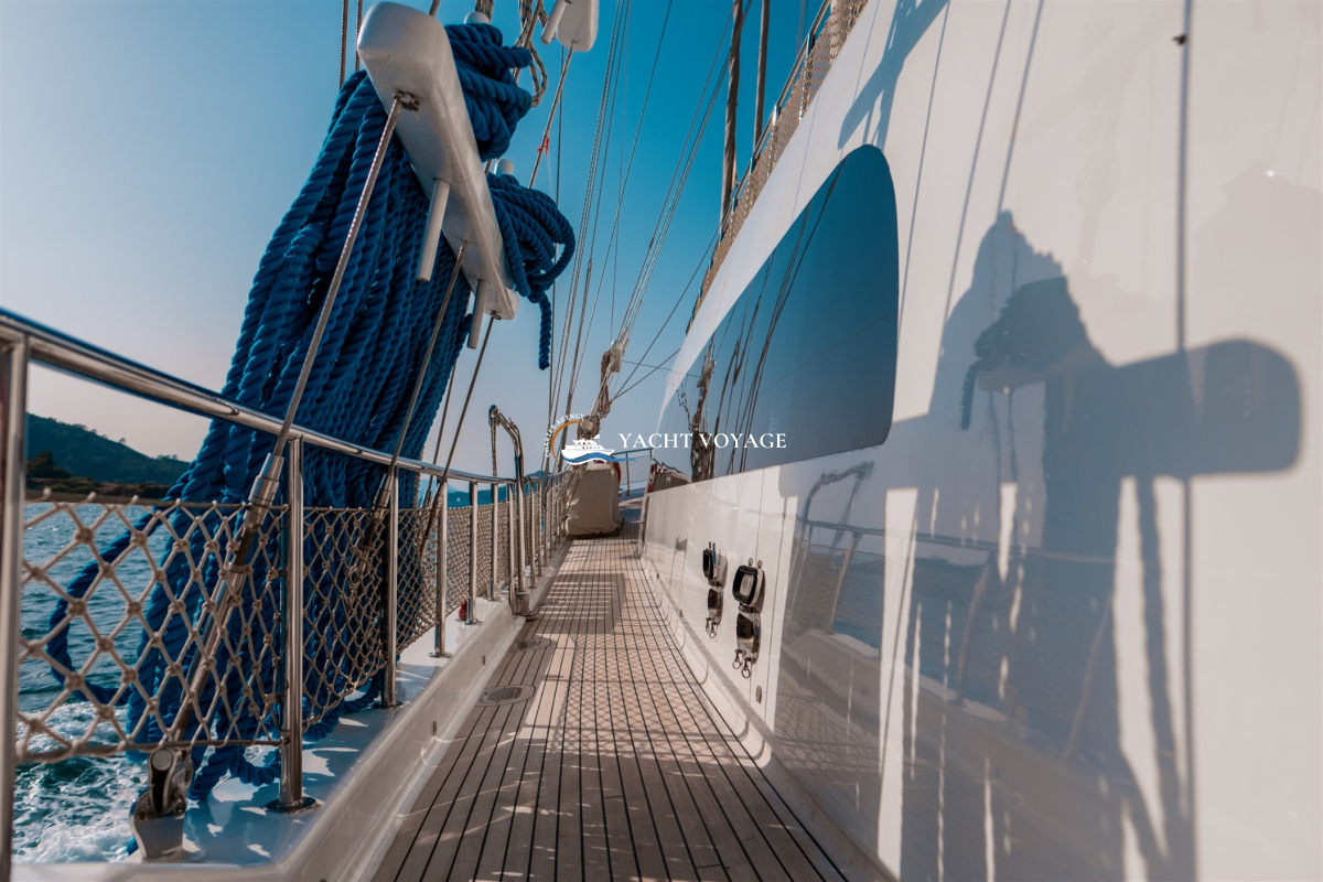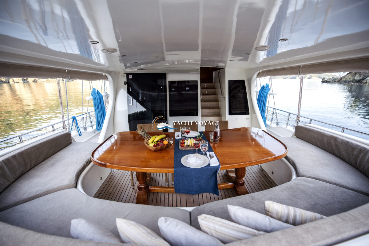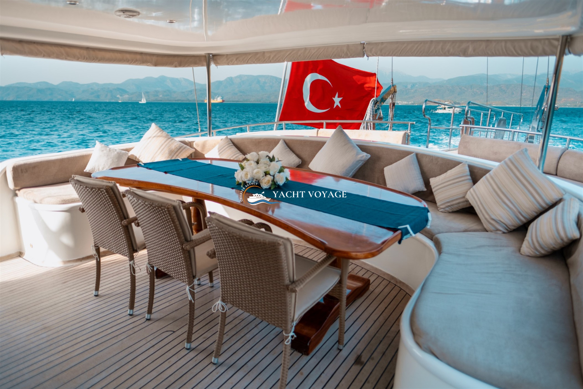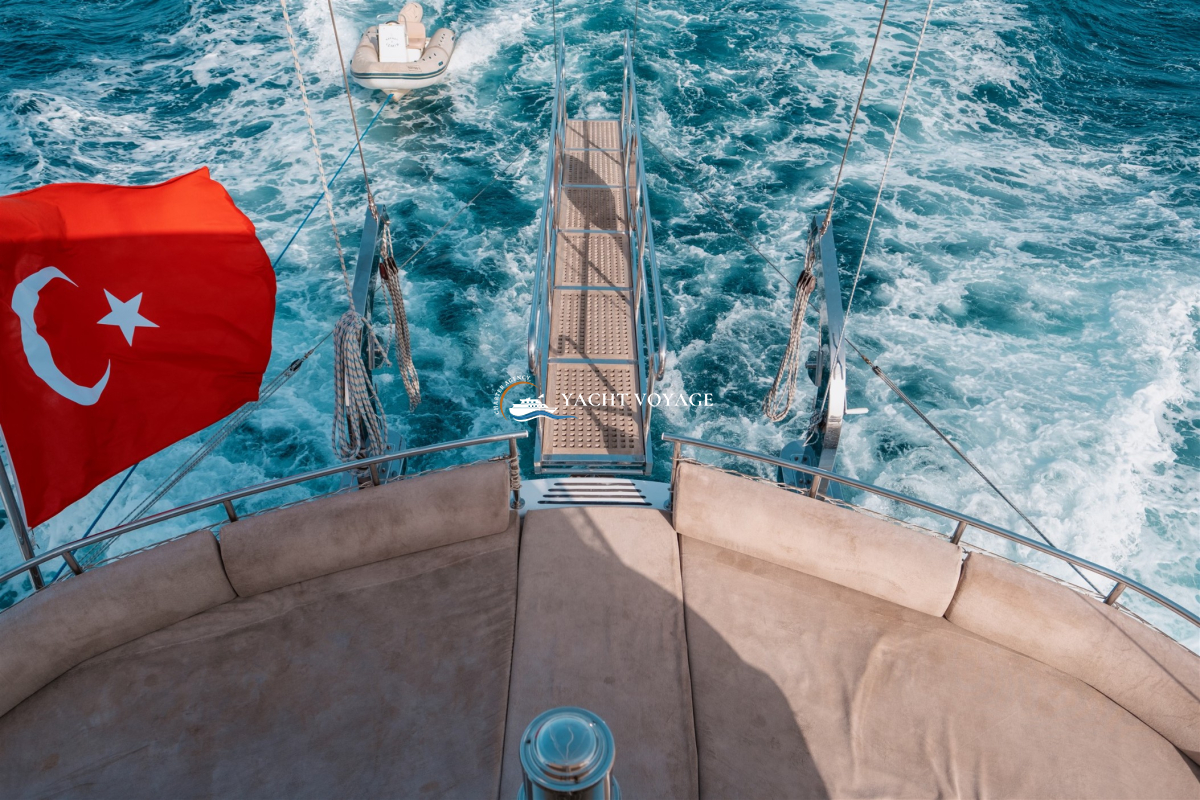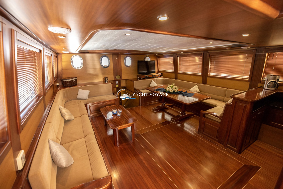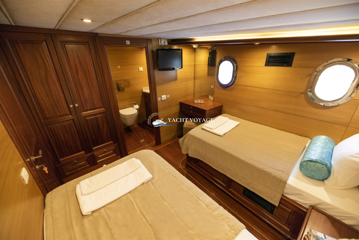Mavi yolculuk tatilinizde özlediğiniz kalite ve konforu bir arada sunan lüks teknemiz, geniş ve şık yaşam alanlarıyla hizmetinizdedir. 29 metre uzunluğunda olan teknemiz, 5 adet kabiniyle 10 kişiye kadar olan nezih misafirlerimizi ağırlayabilme kapasitesine sahiptir. Her biri alanında deneyimli ve güleryüzlü 4 kişilik mürettebatımız, memnuniyetiniz odaklı ve kaliteli servis anlayışıyla hizmetinizdedir