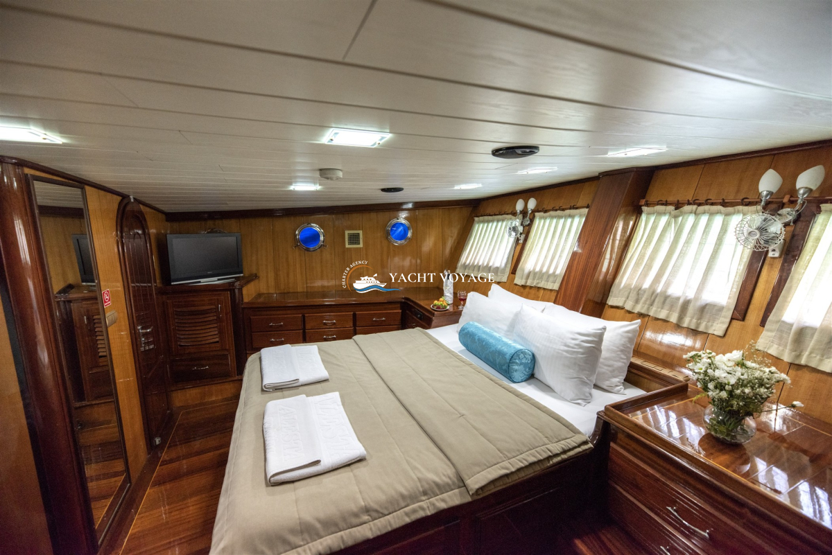 2010 yılında komple revize edilen teknemiz, mavi yolculuk tatiliniz boyunca ihtiyaç duyabileceğiniz her detay düşünülerek donatılmıştır. Geniş yaşam alanlarına ve ferah kabinlere sahip teknemiz, 12 kişiye kadar olan gruplarınızı misafir edebilme potansiyeline sahiptir. Her biri alanında deneyimli ve güler yüzlü 4 kişilik mürettebatı mavi tur süreniz boyunca kaliteli servis anlayışıyla hizmetinizdedir.